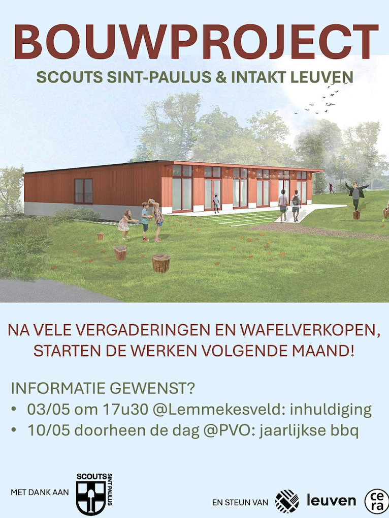 * Een fiscaal aftrekbare gift van 40 € of meer kan gestort worden op het rekeningnummer BE55 4096 5041 4144 (KREDBEBB) van Scouts en Gidsen Vlaanderen. Voor een vlotte verwerking vragen we om volgende mededeling te gebruiken: Gift, FAG 5-444, Nieuwe Lokalen St Paulus-Intakt, ‘uw mailadres’