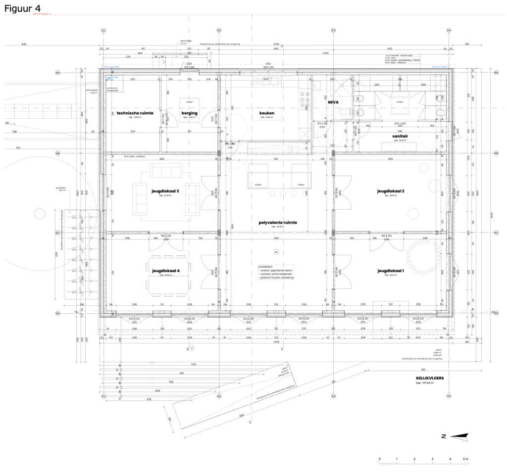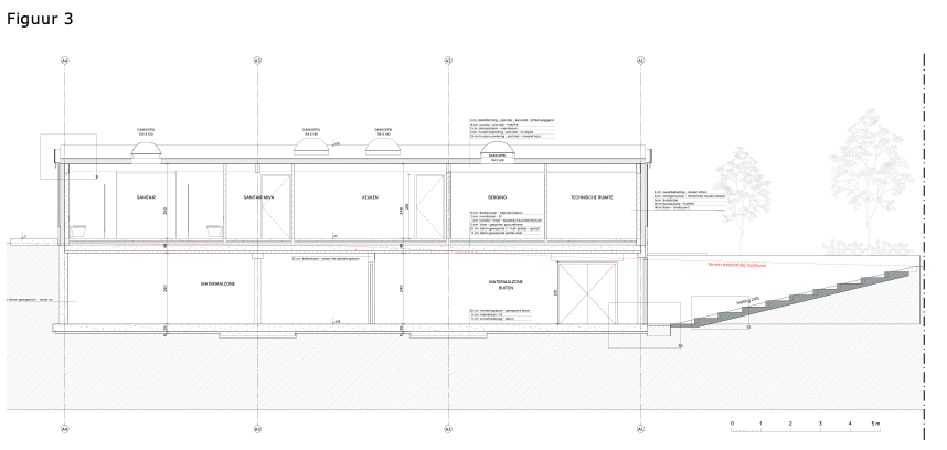 Het was dus al een tijd duidelijk dat Scouts Sint-Paulus en Scouts Intakt Leuven toe waren aan een nieuwe thuis. Daarom werkt een enthousiaste en geëngageerde groep oud-leden en ouders, samen met stad Leuven en architectenbureau Czaar, reeds 10 jaar aan nieuwe plannen. De huidige lokalen worden afgebroken en een duurzame nieuwbouw wordt voorzien. Beide groepen willen hun volledige werking op het Lemmekesveld samenbrengen. Op de huidige locatie van de lokalen was het om verschillende redenen niet mogelijk om de nodige riolering en nutsvoorzieningen volgens de actuele normen te voorzien. Na uitgebreide studie en overleg met Stad Leuven werd gekozen voor plaatsing bovenaan het Lemmekesveld aansluitend aan de parking (fig. 1). Om de impact van de nieuwe lokalen op het Lemmekesveld en de buurt te minimaliseren wordt een verdieping ingegraven en zo veel mogelijk gekozen voor natuurlijke materialen (fig. 2). In de benedenverdieping komt een ruime materiaalberging (fig. 3). Er is gekozen om niet voor elke tak van een eigen vast lokaal te voorzien, maar om met de beschikbare ruimte maximaal in te spelen op de noden tijdens het scoutsjaar en op jaarlijkse evenementen. Op het niveau van het Lemmekesveld komt er daarom naast 2 vaste lokalen een polyvalente zaal die door middel van wegneembare wanden flexibel kan opgesplitst worden in 3 afzonderlijke lokalen (fig. 4). Aansluitend aan de polyvalente ruimte wordt een volledig uitgeruste keuken en voldoende sanitair voorzien. We streven naar een volledige toegankelijkheid en onafhankelijkheid van rolstoelgebruikers binnen het gebouw voor zowel het gebruik van lokalen, keuken als sanitair. Samen met stad Leuven bekijken we de mogelijkheden om de nieuwe lokalen te verhuren aan andere organisaties. Zo kan de speelpleinwerking van Heverlee er hun vakantie-activiteiten organiseren, maar zullen ook andere verenigingen en de buurtwerking ervan gebruik kunnen maken voor vergaderingen of (buurt)activiteiten. We blijven daarover in nauw overleg met de Matadi-buurt.